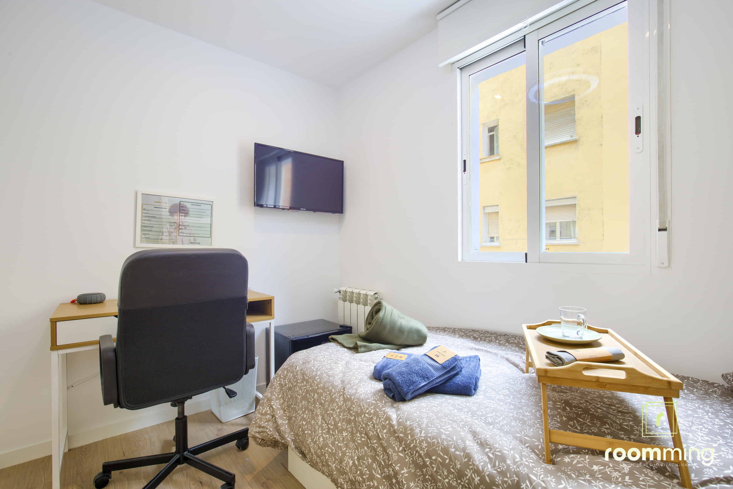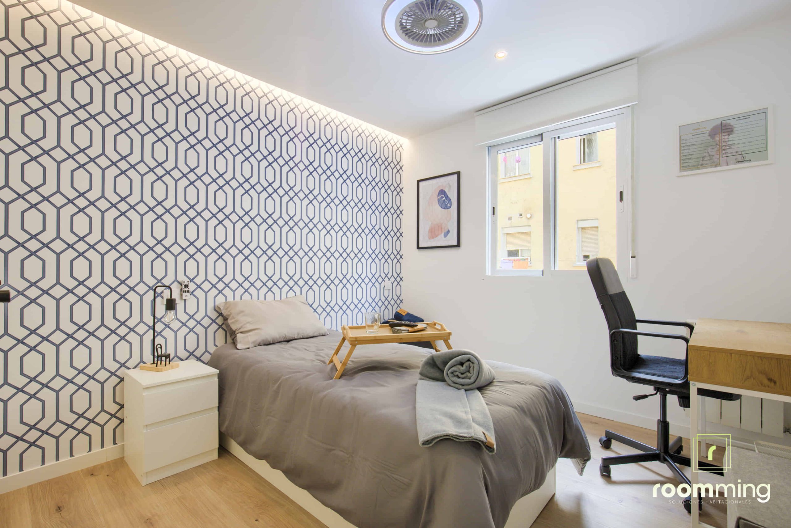 Habitación confortable y exterior, dentro de la vivienda San Valero1. Situada la segunda, cuenta con todas las comodidades que todo estudiante puede demandar. Desde la cama con un colchón premium, canapé con gran almacenaje, escritorio + silla, hasta smart TV, climatización, caja fuerte, etc…