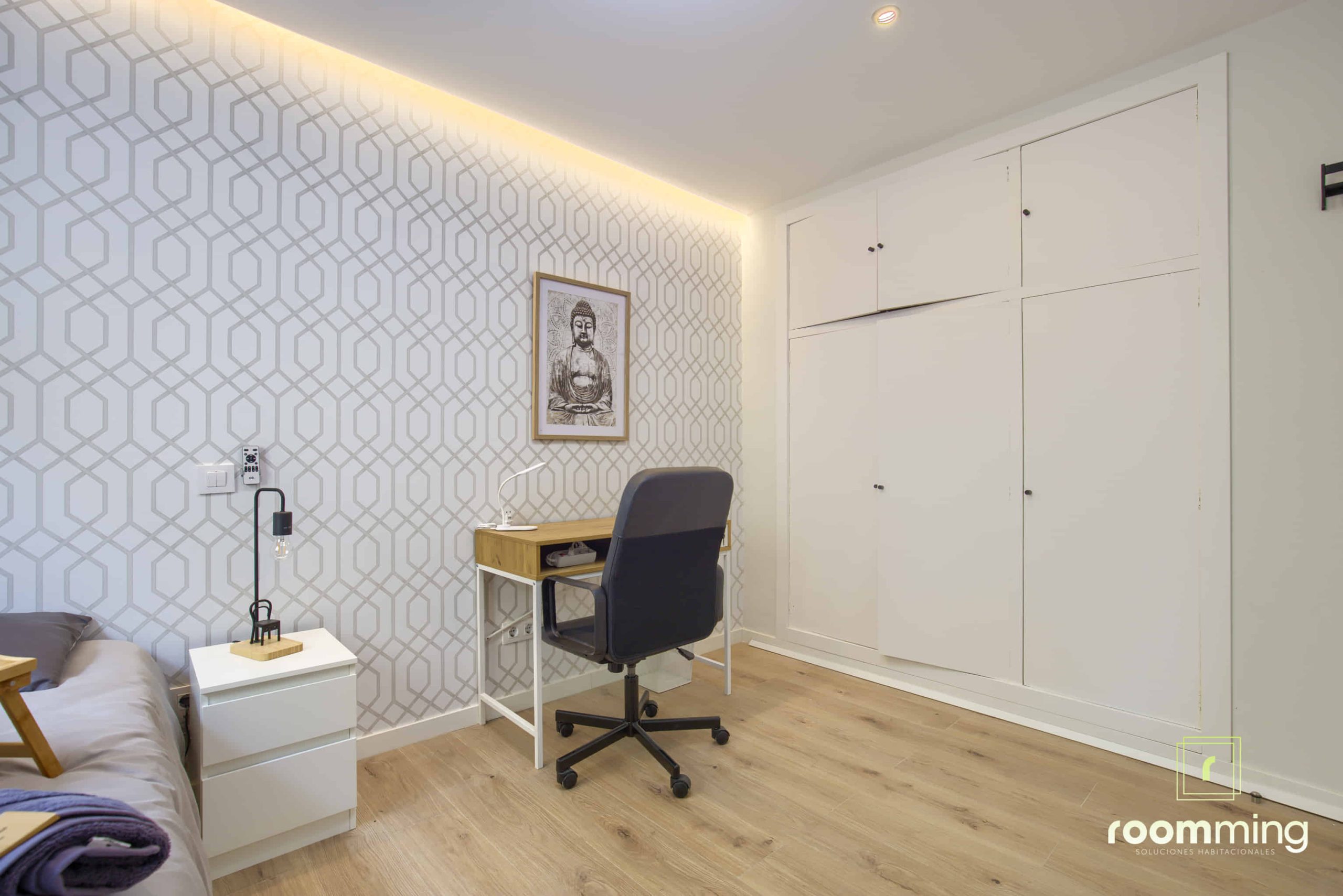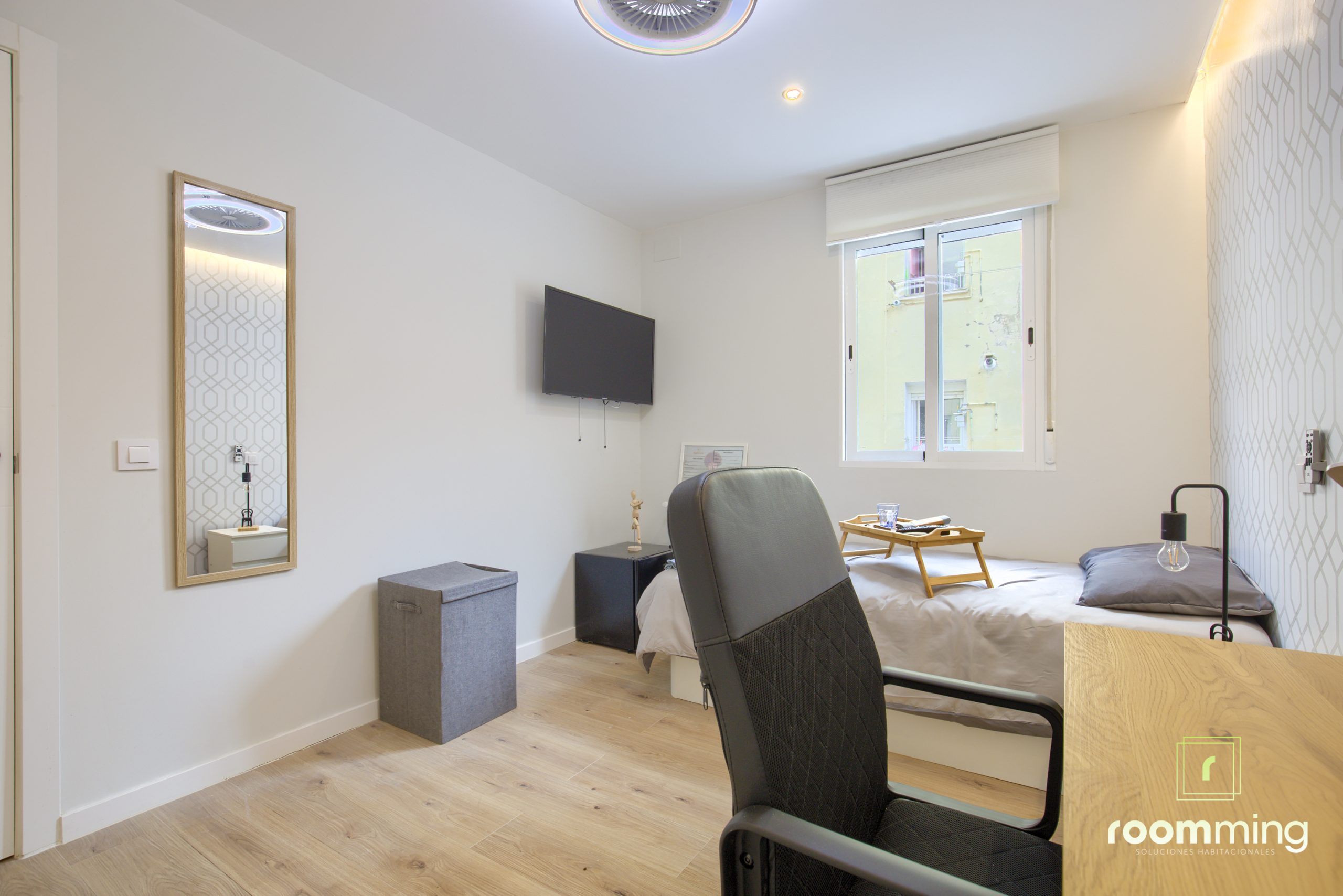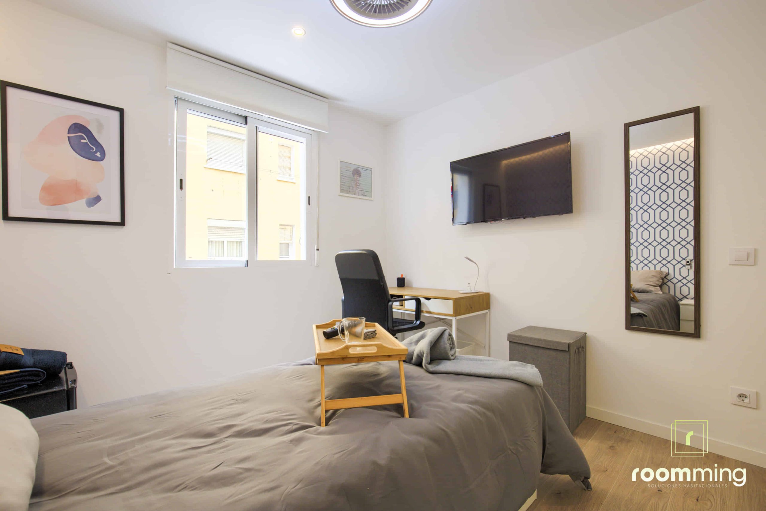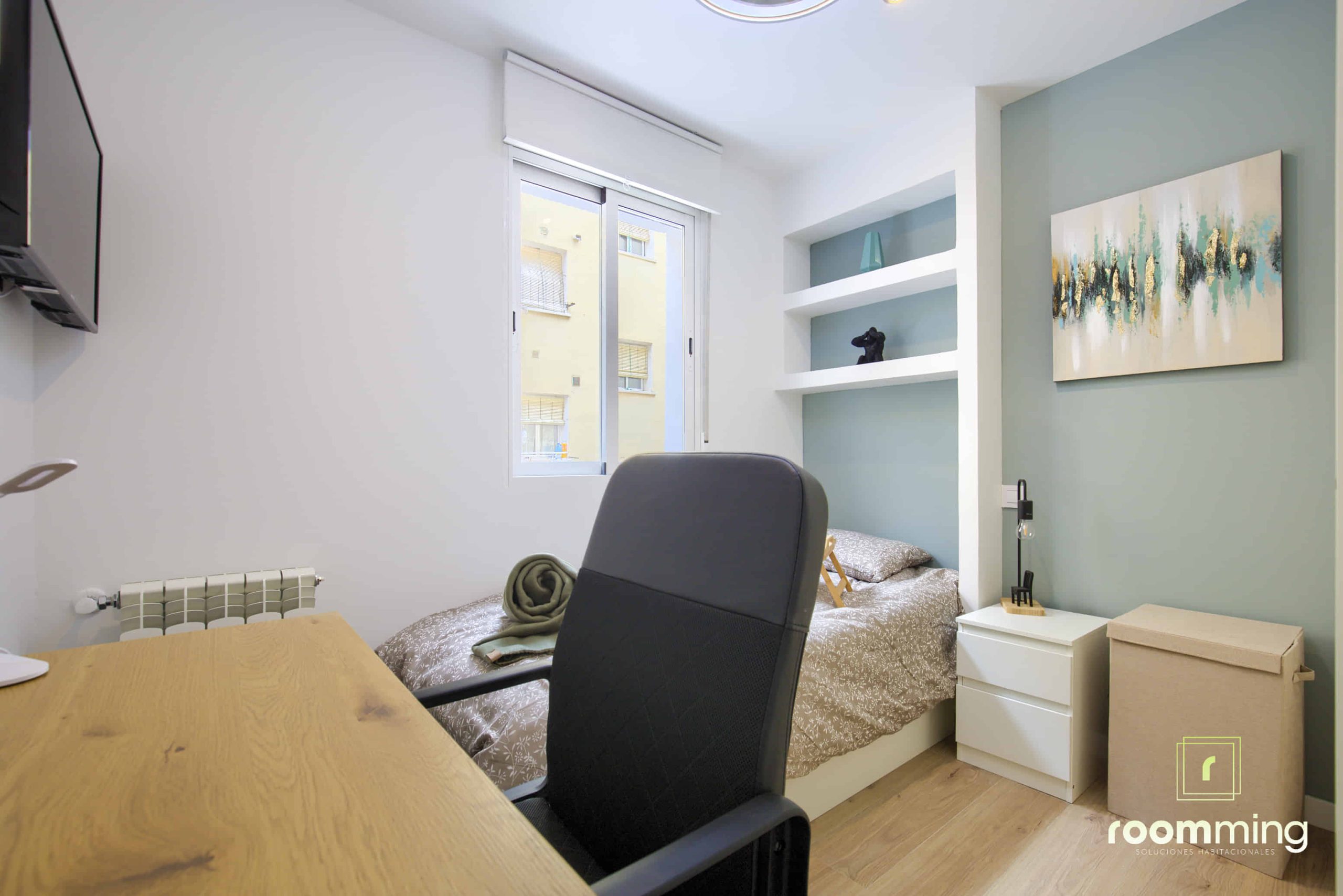 Habitación boutique exterior, dentro de la vivienda San Valero1. Situada la cuarta, cuenta con todas las comodidades que todo estudiante puede demandar. Desde la cama con un colchón premium, canapé con gran almacenaje, escritorio + silla, hasta smart TV, climatización, caja fuerte, etc…