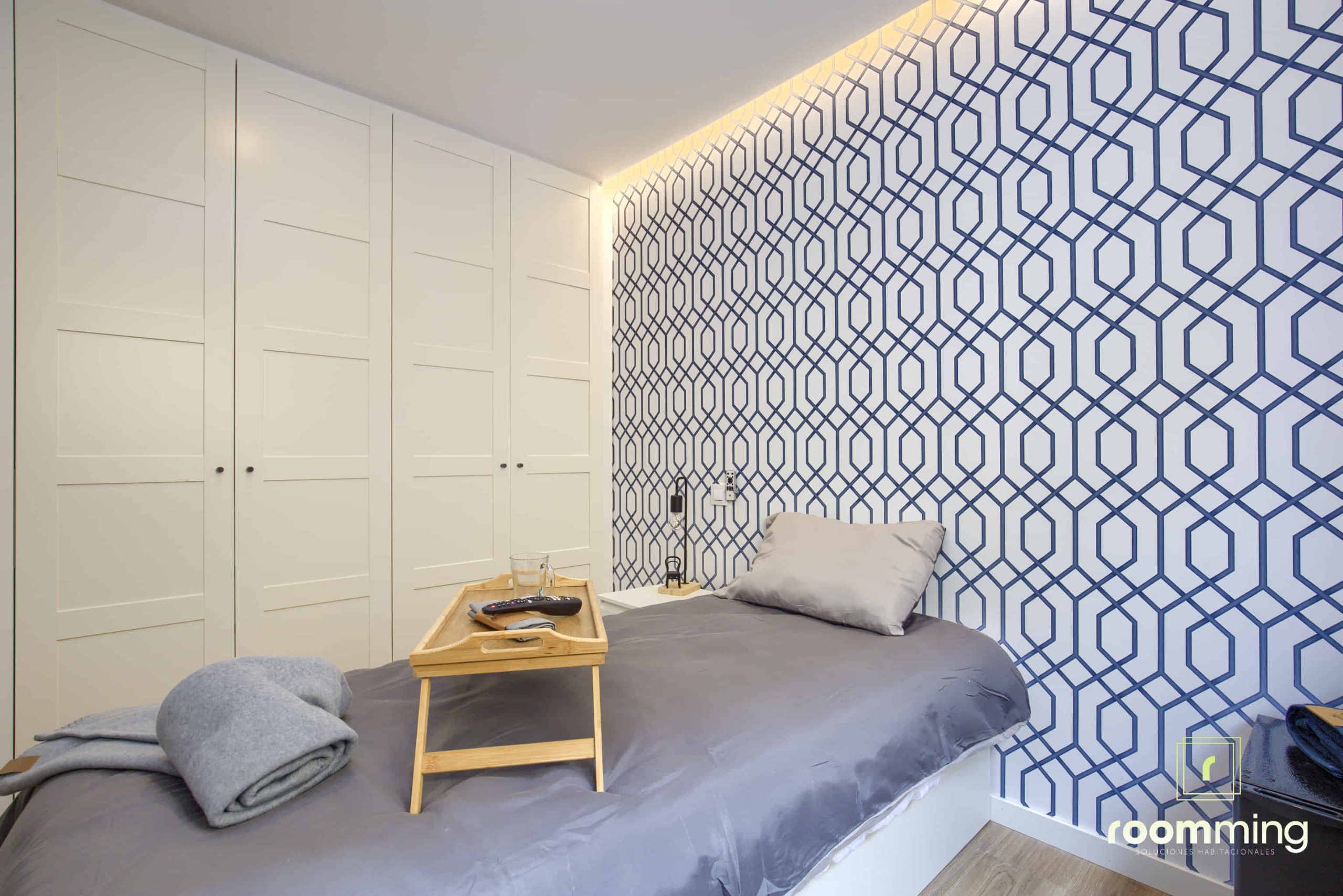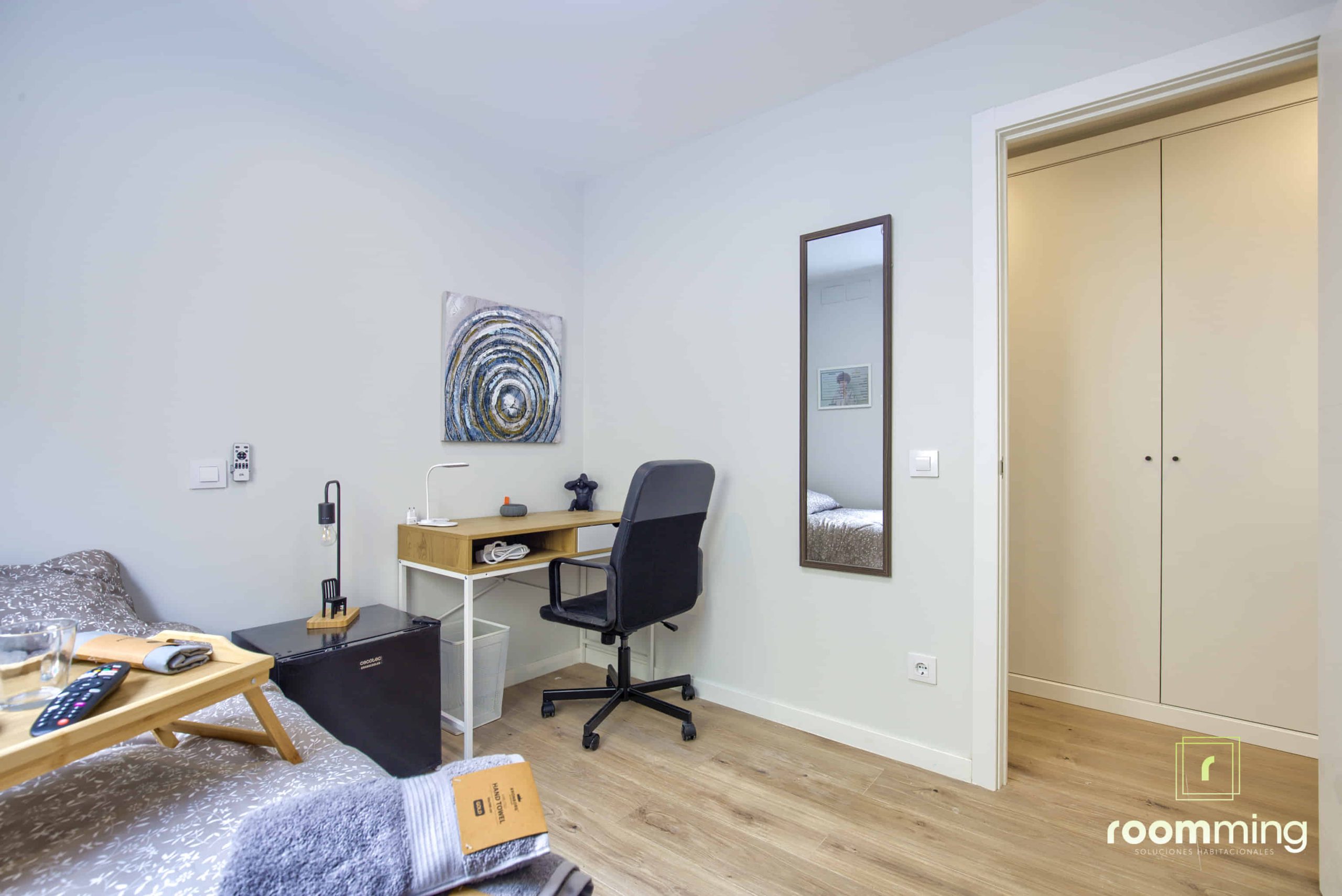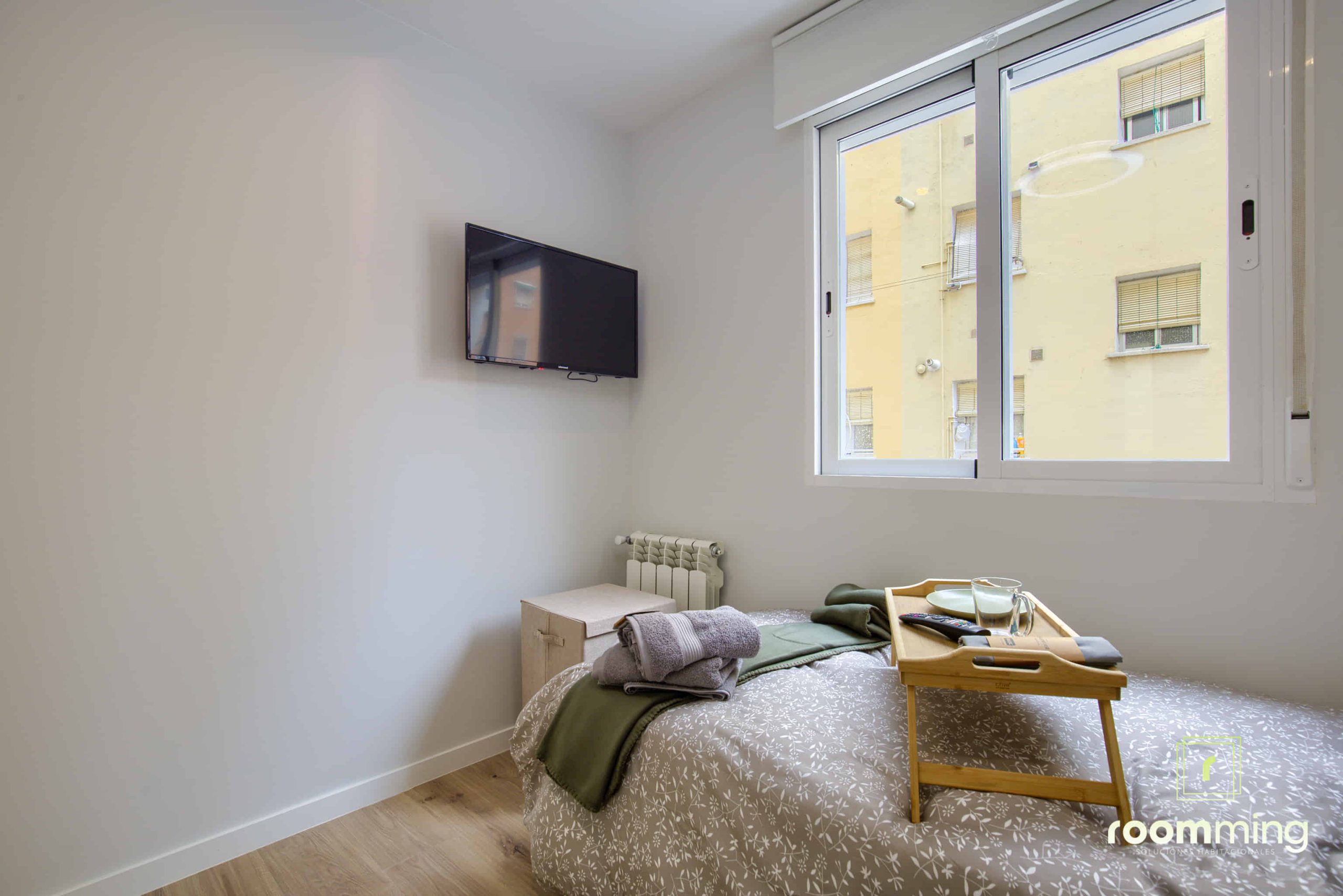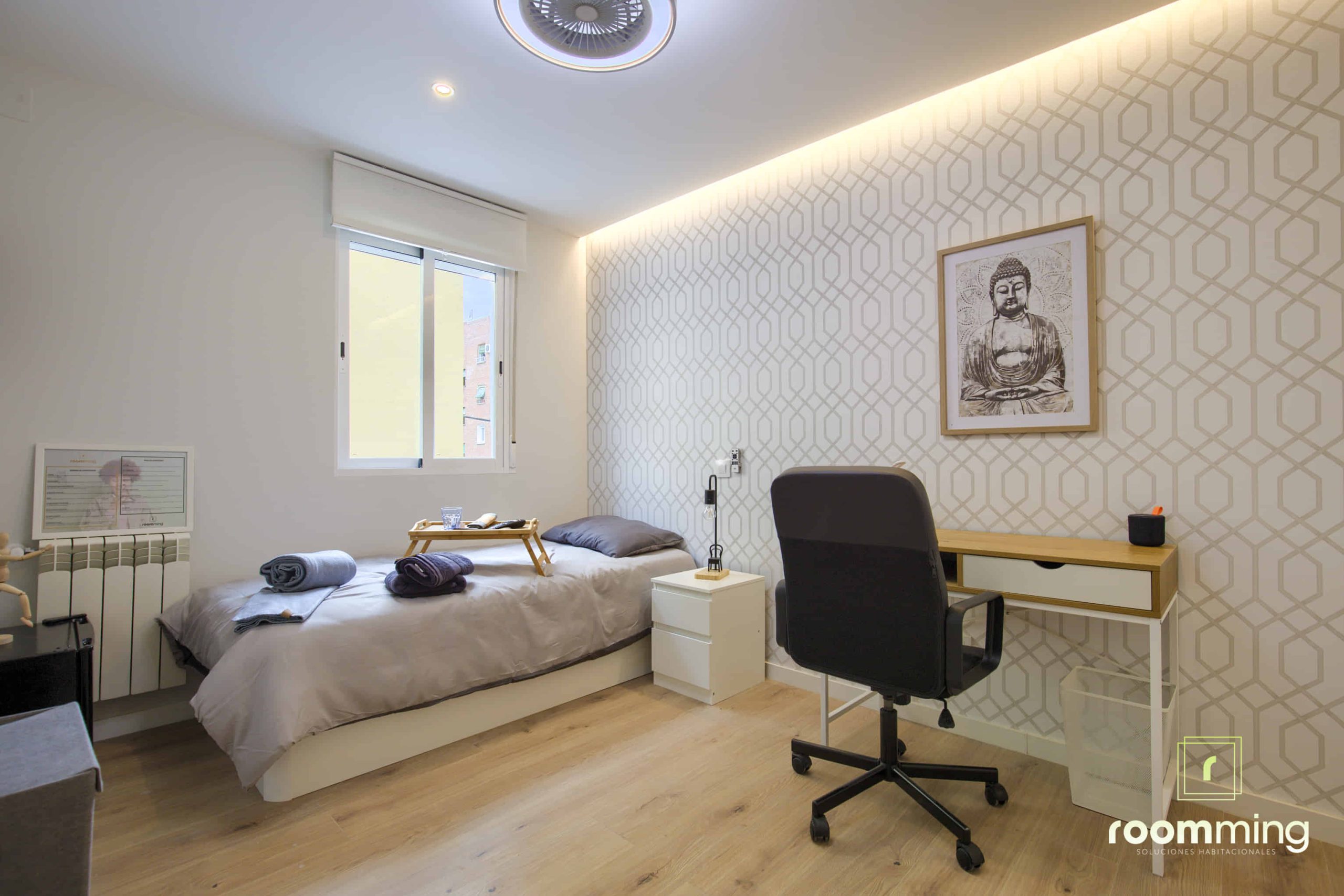 Habitación boutique exterior, dentro de la vivienda San Valero1. Situada la cuarta, cuenta con todas las comodidades que todo estudiante puede demandar. Desde la cama con un colchón premium, canapé con gran almacenaje, escritorio + silla, hasta smart TV, climatización, caja fuerte, etc…