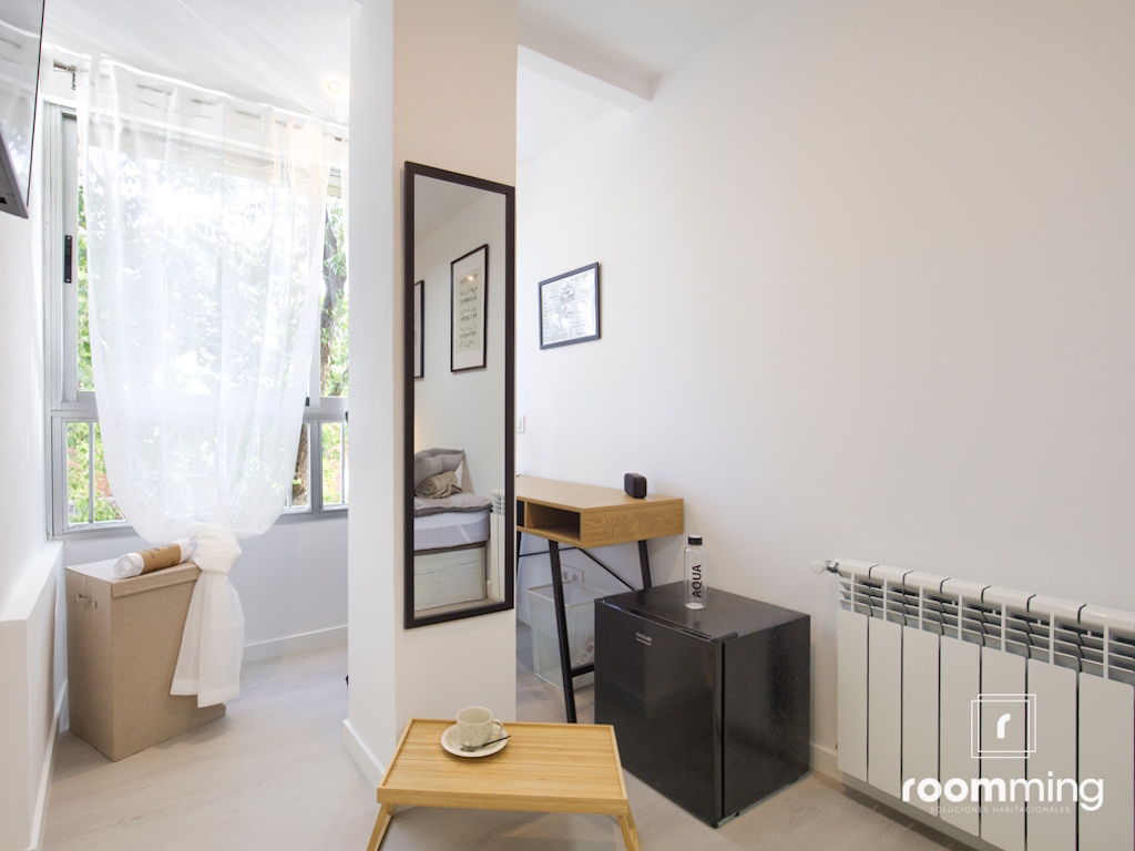 Habitación Boutique, dentro de la vivienda Emilio Ferrari 80. Cuenta con todas las comodidades que todo estudiante puede demandar. Desde la cama con un colchón premium, canapé con gran almacenaje, escritorio + silla, hasta smart TV, climatización, caja fuerte, etc…