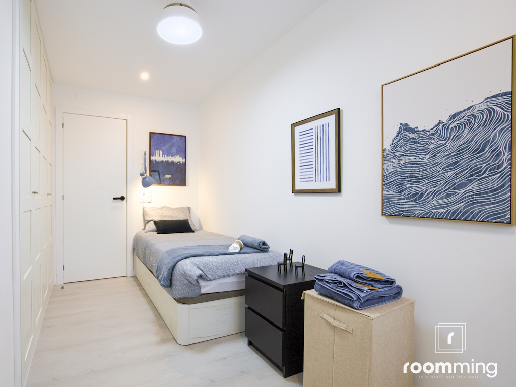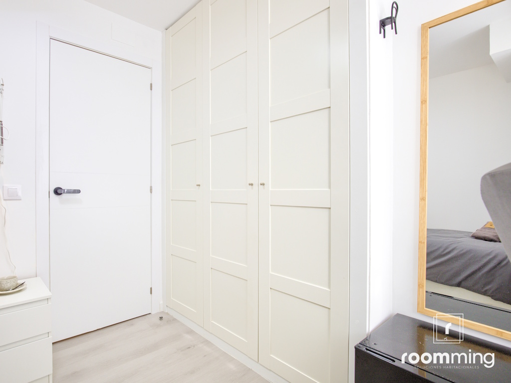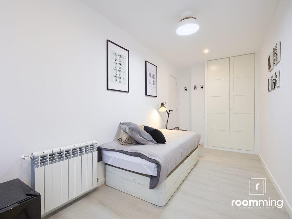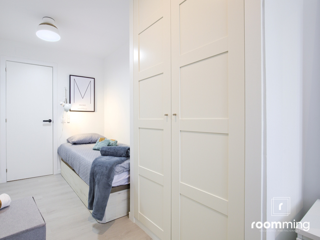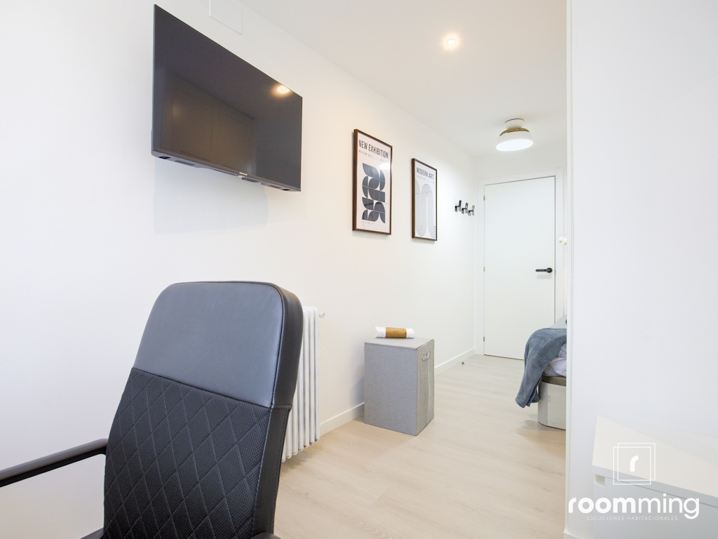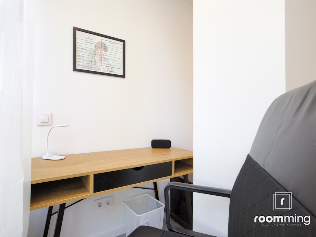 Habitación confortable dentro de la vivienda Emilio Ferrari 80. Cuenta con todas las comodidades que todo estudiante puede demandar. Desde la cama con un colchón premium, canapé con gran almacenaje, escritorio + silla, hasta smart TV, climatización, caja fuerte, etc…